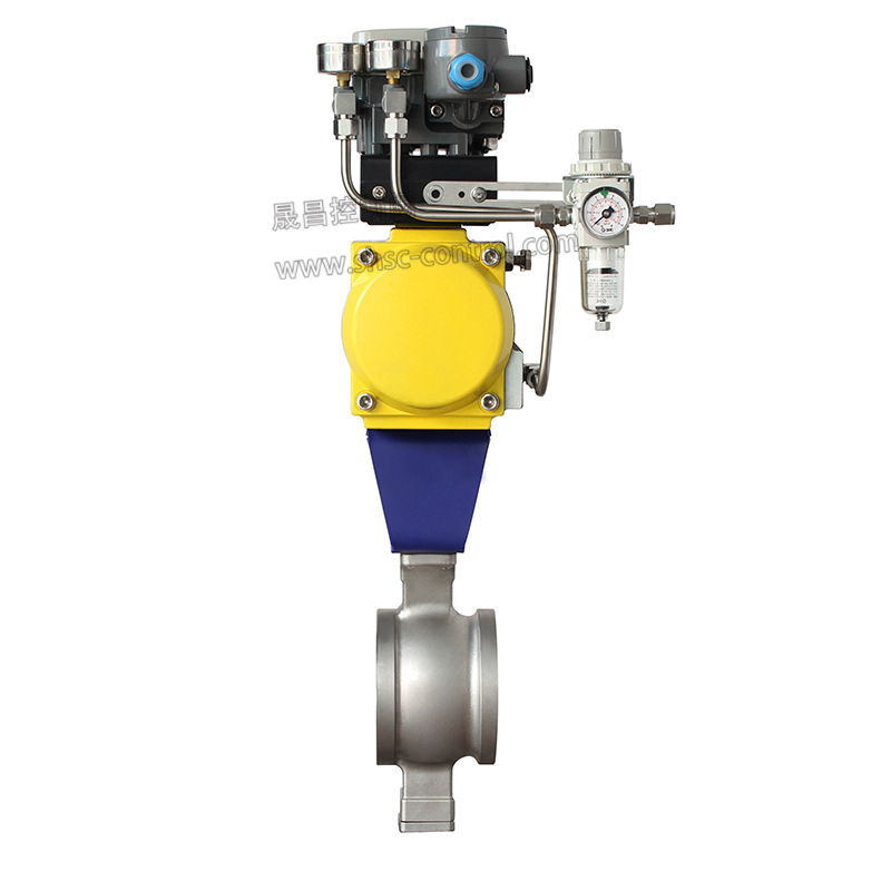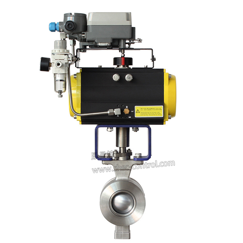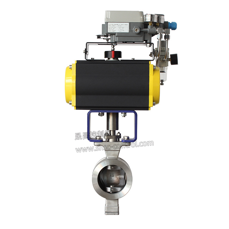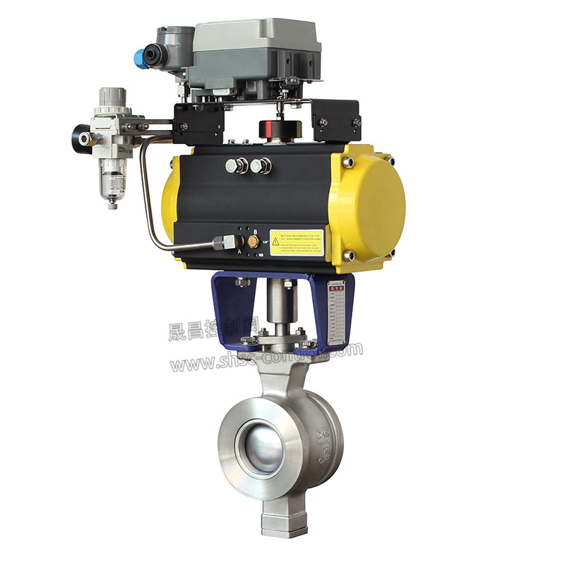 气动V型球阀,由活塞式气动执行机构和V型球阀组成,是一种由V型切口球面阀板在小开度范围内贴着密封面旋转而控制流体的角行程调节阀。V型切口球面板在增大调节比的同时,在截流时对密封环还有剪切作用,因此气动V型球阀适用于要求大调节比的控制系统,以及对含纤维质流体、料浆类流体的控制。气动V型球阀适用于两位切断、调节的场合,可配阀门定位器输入控制信号(4-20mADC或1-5VDC)气源即可控制运转。亦可配行程限位开关、电磁阀、三联件及0.4-0.7MPa气源可实现开关操作,并送出二对无源触点信号指示阀门的开关气动V型球阀具有连线简单,结构紧凑、尺寸小、重量轻、阻力小、动作稳定可靠等优点。气动V型球阀广泛应用于石油、化工、电力、冶金、钢铁、造纸、医药、食品、纺织、轻工等行业。